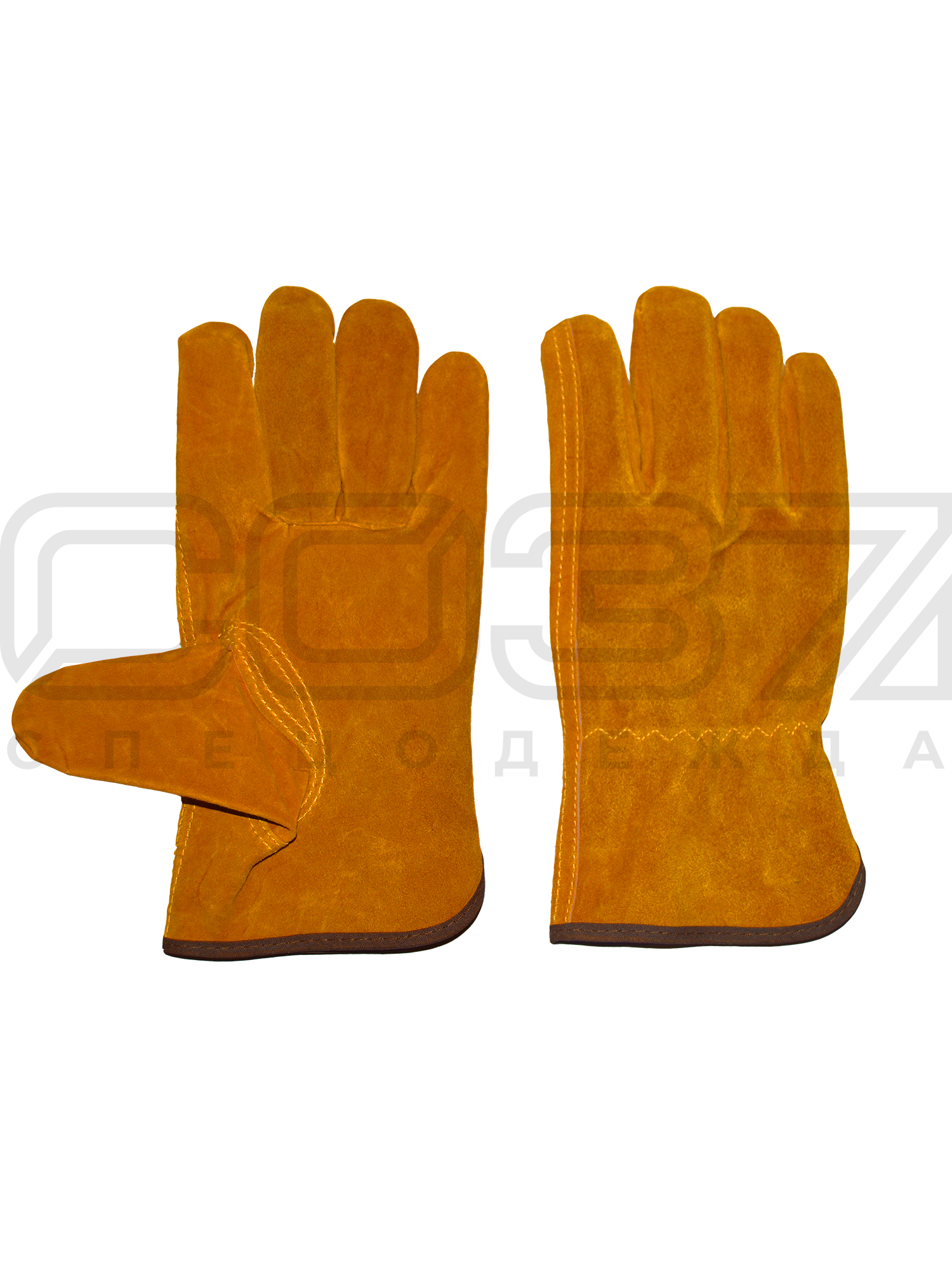 - Перчатки сшиты из высококачественного спилка КРС, равномерно прокрашенного в жёлтый (золотой) цвет.